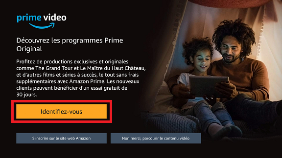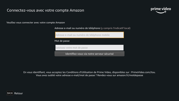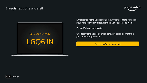 Rendez-vous sur www.PrimeVideo.com/mytv : saisissez le code affiché sur votre télévision